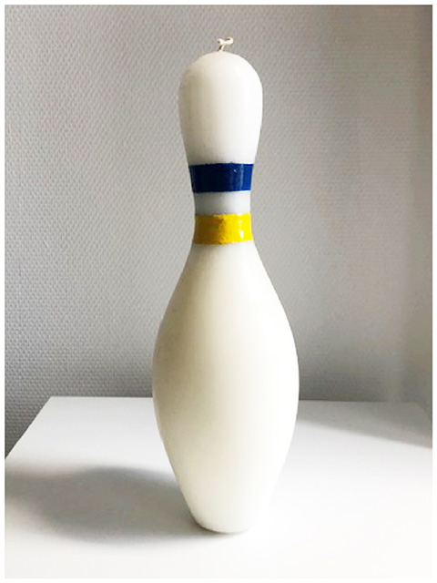>The Bowling cone exists out of paraffins =candle with round symbolic necklace. Publications in Knack, Humo, ...